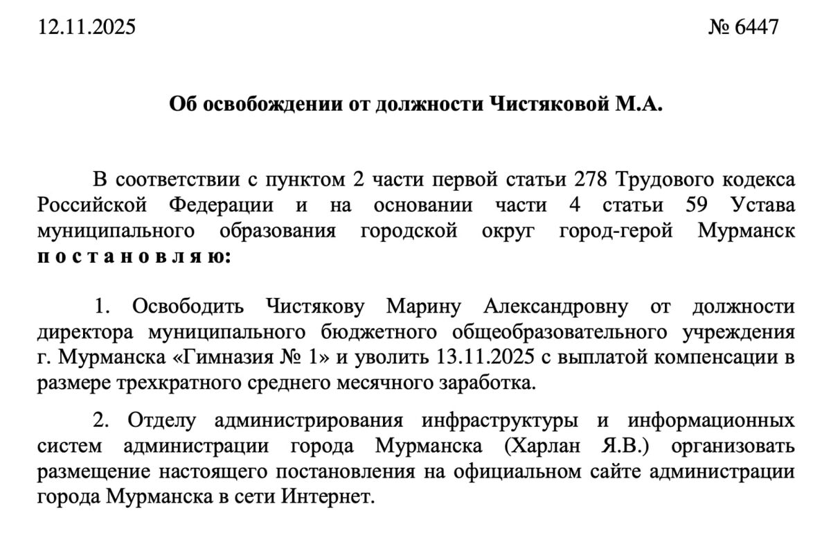 Иван Лебедев внезапно (одним днём) уволил директора гимназии № 1 Марину Чистякову. Соответствующее постановление опубликовано на сайте горадминистрации. Согласно документу, экс-директору будет выплачена компенсация в размере трехкратного среднего месячного заработка. Вряд ли стоит осуждать Ивана Лебедева, ещё незнакомого со всеми заслуженными учителями столицы Заполярья. Да и источники «АО» из системы образования полагают, что решение уволить было продавлено министром Кузнецовой через городской отдел (Светлану Воробьёву). #Поговаривают, что причиной увольнения стал затянувшийся конфликт Марины Чистяковой с министром по поводу ремонта. Открывшаяся в 1985 году школа № 40 первой в Мурманске получила гимназический статус (в 1991 году). В 2025 году в результате реформы системы образования в состав гимназии № 1 была включена школа № 53 (на Папанина, 3). Марина Чистякова руководит учебным заведением с 2014 года. ❄ «Арктический Обозреватель»