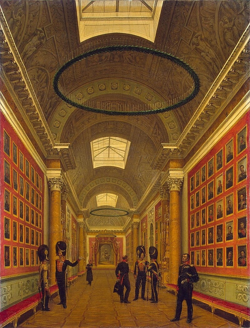 В Военной галерее Зимнего дворца размешены 332 портрета военачальников русской армии, участников Отечественной войны 1812 года и заграничных походов русской армии 1813–1814 годов. В галерее находятся также 13 пустых, затянутых зеленым шелком рам, на которых обозначены воинские звания и имена генералов, чьи изображения не сохранились.
