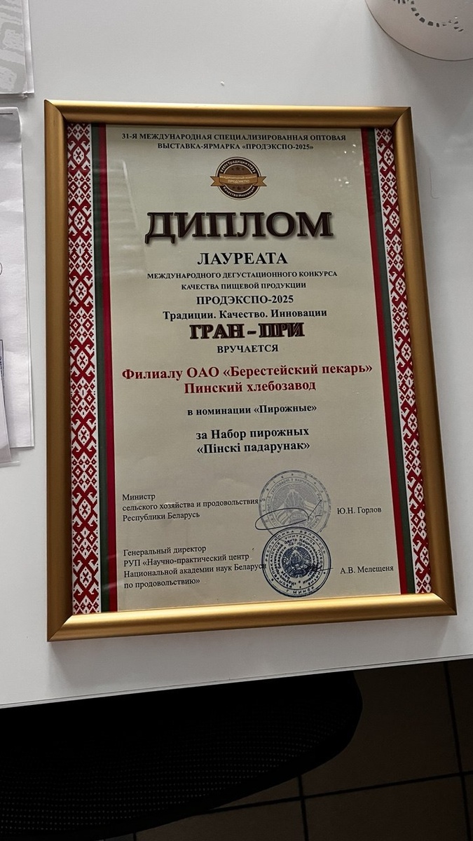 🇧🇾В Минске прошла 31-я международная специализированная оптовая выставка-ярмарка PRODEXPO-2025. 📌По итогам конкурса «Традиции. Качество. Инновации» в номинации «Пирожные» Пинский хлебозавод удостоен Гран-при за набор пирожных «Пінскі падарунак». На международном конкурсе кондитерского искусства было представлено 125 работ мастеров от Хабаровска до Минска. В номинации «Работа из мастики» хлебозавода кондитер Наталья Слаута завоевала серебряную медаль. @Пинский Вестник ЮТУБ | САЙТ| ИНСТ | ВК | ОК | ФЕ | Прислать новость