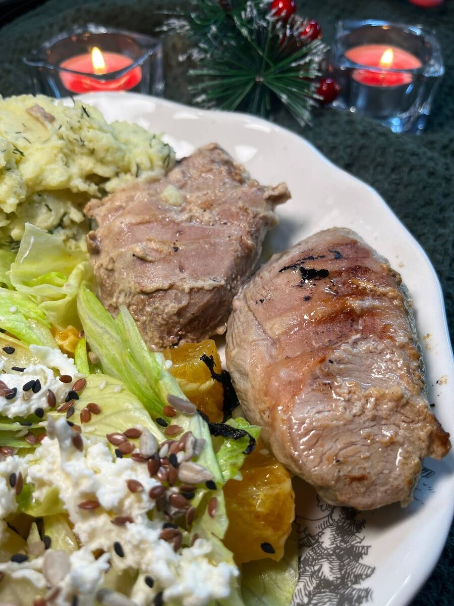 Делюсь с вами своими заготовками. У меня есть большой пост в ДЗЕН (https://dzen.ru/makargotovit) про заготовки — он лежит в разделе «Подборки». Если интересно, обязательно загляните и почитайте. А здесь хочу отдельно рассказать про мой любимый медово-горчичный соус. Я обожаю этот маринад — готова есть его ложками! В этот раз я замариновала в нём голень индейки — получилось невероятно вкусно и ароматно. Что делаю: • смешиваю 2 ст. ложки сметаны, • добавляю 2 ч. ложки горчицы (у меня были остатки), • кладу 1 ч. ложку мёда, • всё перемешиваю и покрываю этим мясо. Дальше можно: — запечь в духовке, — обжарить на сковородке, — или положить на гриль (я выбрала этот способ) Получается сочное, ароматное мясо с лёгкой сладостью и золотистой корочкой — попробуйте обязательно, вам понравится! КБЖУ (на 100 г готового блюда): 165 ккал • Б 19 г • Ж 8 г • У 2 г 🍾🍾🍾