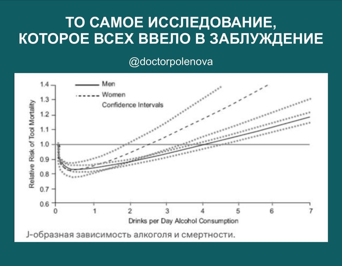 Помните, не так давно господствовало вредоносное мнение о том, что, например, мужчинам полезно выпивать в неделю больше 0.5 литра водки или почти две бутылки крепленого вина. Было даже принято рассчитывать "здоровую дозу алкоголя" и по американской традиции называли это «дринками». 🩺Однако наука не стоит на месте и теперь во Всемирной организации здравоохранения считают, что полезных норм потребления спирта нет. Исследователям алкоголя хорошо известен такой феномен, как 🔤-образная кривая. Если смотреть на связь между дозой алкоголя и рисками заболеваний, то может показаться, что у трезвенников риск выше, чем у тех, кто пьёт умеренно. Но это, скорее всего, ошибка выборки: в группу непьющих часто попадают люди, которые уже имеют проблемы со здоровьем или отказались от алкоголя из-за болезни. Это искажает картину, создавая ложное ощущение «пользы» малых доз. ➡️Предлагаем разобрать два мифа о бокале красного за ужином: 1️⃣Риск инфаркта и инсульта снижается от бокала вина Даж