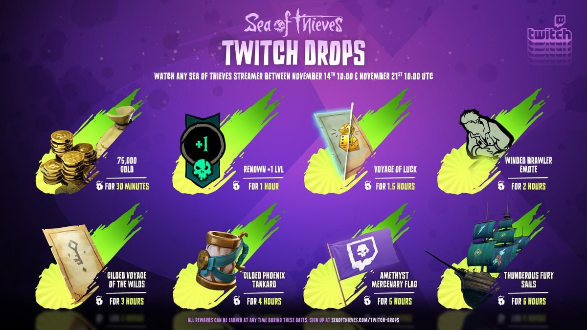 Twitch Drops в эфире! Зарабатывайте славу, золото, путешествия и косметические предметы, просто смотря трансляции Sea of Thieves у любых участвующих стримеров до 21 ноября (13:00 по МСК). Проведите шесть часов за просмотром — и получите все награды, показанные на изображении выше!