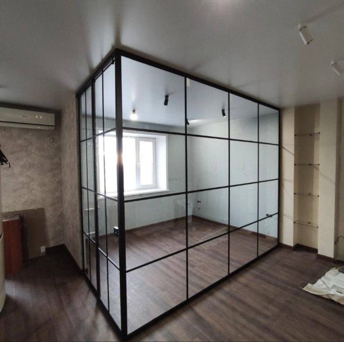 Решение: Стеклянные перегородки позволяют создать визуальное зонирование, не лишая комнату света и ощущения простора. Они обеспечивают легкость и прозрачность, что делает пространство более открытым и воздушным.