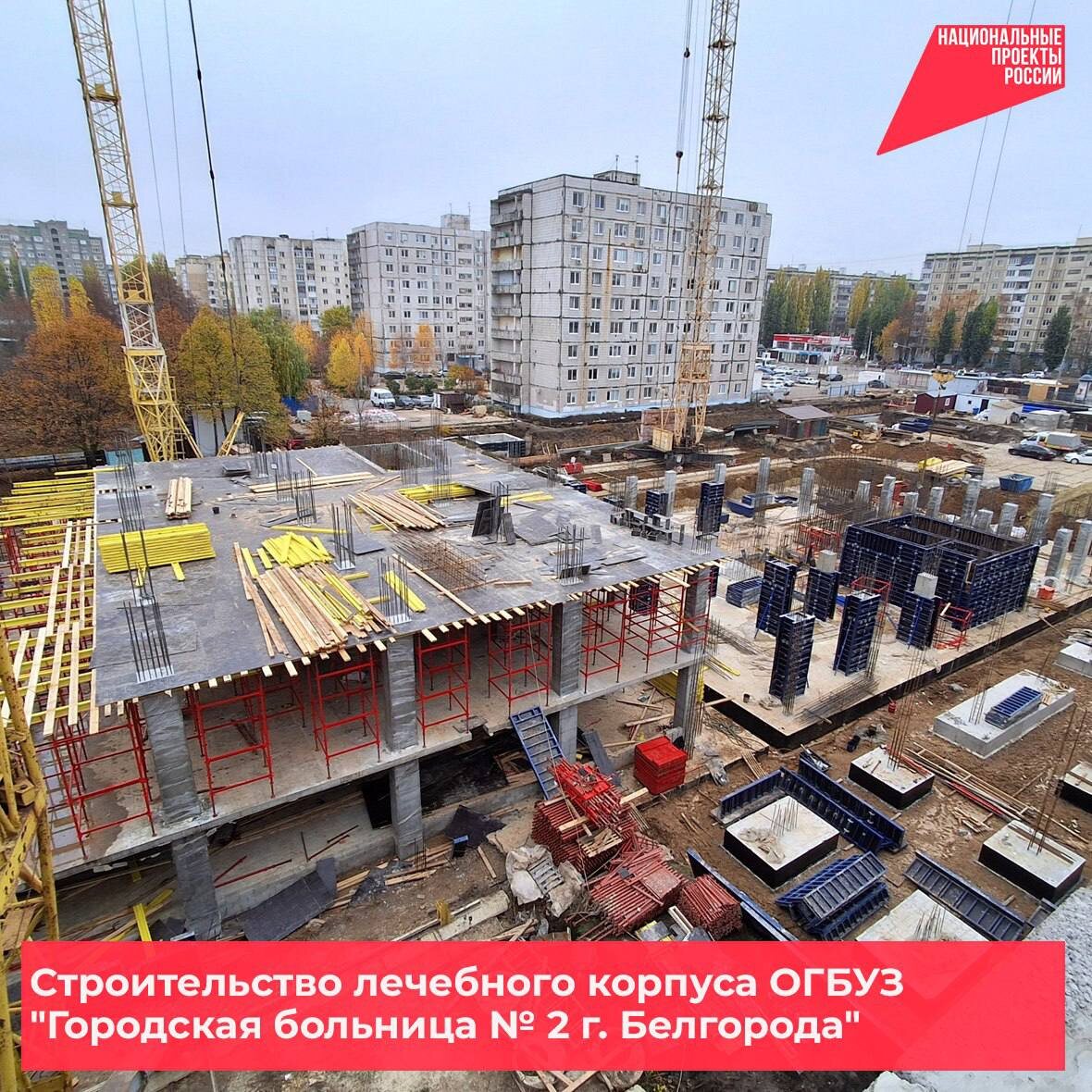 Продолжается строительство лечебного корпуса городской больницы № 2 в Белгороде 🛠 Текущий этап работ: 🔸перенос теплотрассы, вынос ливневой канализации; 🔸прокладка наружных сетей водоснабжения и электроснабжения. Блок «А»: 🔹кладка стен выше отметки 0.00, парапета и вентшахт на кровле 🔹гидроизоляция полов. Блок «Б»: 🔹монтаж колонн цокольного этажа 🔹устройство чернового пола и стен. Блок «В»: 🔹земляные работы (котлован), 🔹устройство буронабивных свай и ростверков. Основные детали проекта: Вместимость: 400 койко-мест. Срок завершения: ноябрь 2028 года. Бюджет: более 11 млрд рублей по нацпроекту «Продолжительная и активная жизнь». Источник: https://t.me/minstroy31 Мэрия|Белгород в 📱 ТГ 📱 ВК 💜 MAX
