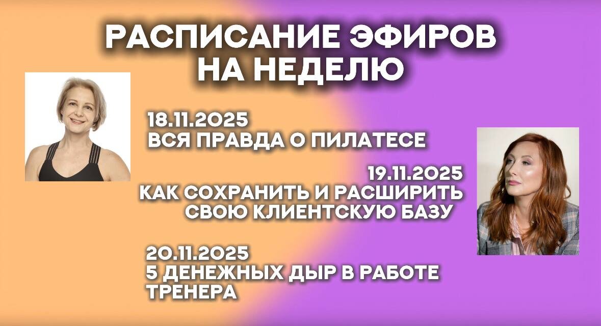 📆РАСПИСАНИЕ ЭФИРОВ НА СЛЕДУЮЩУЮ НЕДЕЛЮ Приглашаем вас на насыщенную информационную неделю на нашем канале! ❗️Онлайн эфиры пройдут на платформе ТЕЛЕМОСТ ЯНДЕКС: • 18 ноября, вторник, в 10:00 Эксперт: Анна Лихманова Тема: "Вся правда о пилатесе" Узнайте, что стоит за популярностью пилатеса и как он может трансформировать ваше тело и сознание. • 19 ноября, среда, в 15:00 Еженедельная закрытая встреча (мастермайнд) резидентов клуба федерации фитнеса Эксперт: Анна Сандул Тема: "Как сохранить и расширить свою клиентскую базу" Давайте обсудим лучшие стратегии по увеличению вашей аудитории и укреплению взаимоотношений с клиентами. • 20 ноября, четверг, в 20:00 Тема: «5 денежных дыр в работе тренера: где теряются твои деньги (и как их вернуть)» От компании: https://7coach.pro/fpfkk Узнайте о ключевых аспектах, которые могут препятствовать вашему финансовому успеху, и получите ценные советы по оптимизации доходов. 🔥Не упустите возможность узнать что-то новое и полезное! Мы ждем вас на