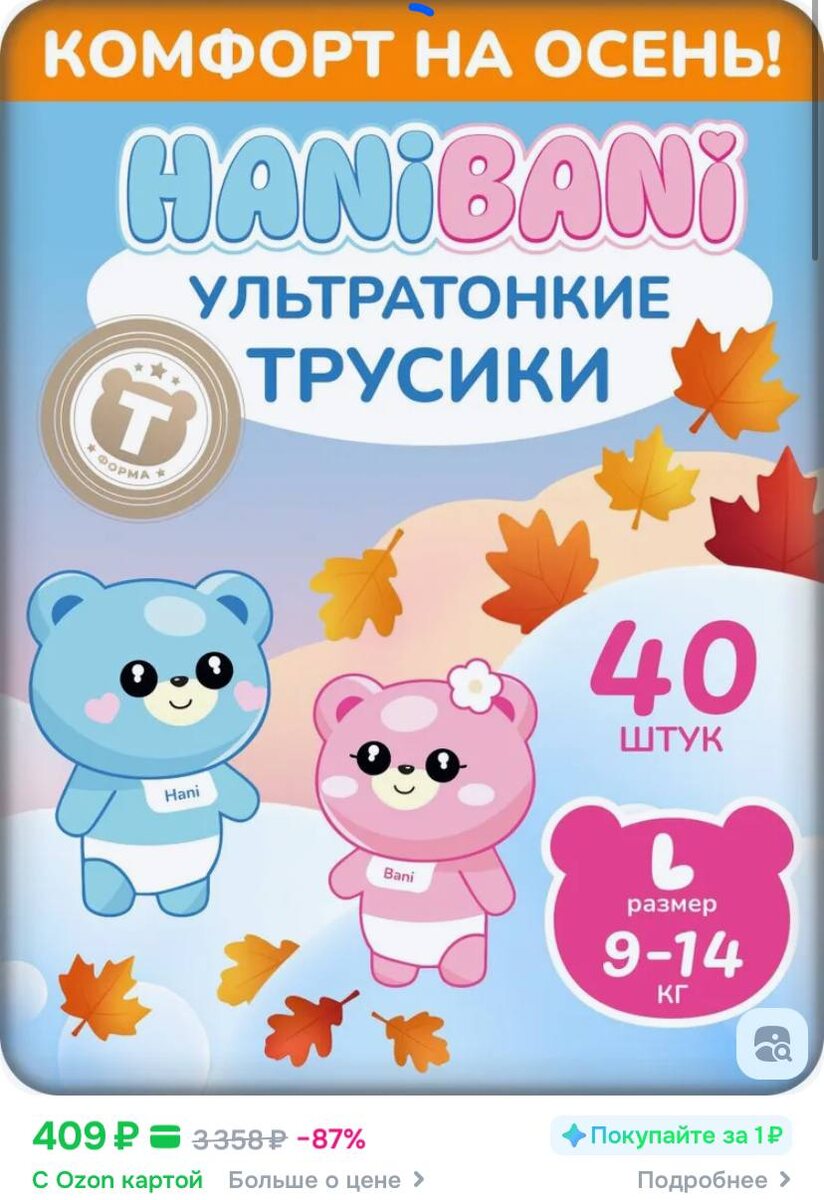 40 штук Подгузники трусики детские для малышей девочек и мальчиков HANIBANI Comfort размер 4L 9-14 кг набор https://ozon.ru/t/EcOEapa Цена на 🛍: 409 ₽ | 3358 ₽ рейтинг: 4.9 ⭐️ выгодная цена 💲 ✅ Подписаться 🔣 Бот с промокодами