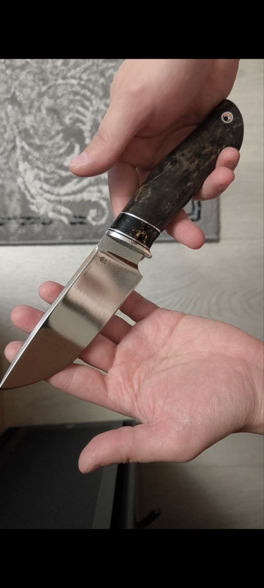 💥Обратная связь, от нашего покупателя Михаила💥 Нож разделочный Н-002, VG-10, глянец с фальшлезвием, стаб. карел. береза, киринит. Большая благодарность за Отзыв 🤝🔥🙏💕 "Нож брался на подарок) Изготовили в обозначенный срок, очень оперативно отправили. Пришло все в целости. Сам нож и ножны, просто безальтернативная вещь за свои деньги! Сделано аккуратно, все ровненько, спуски, фальш симметричный, выход на рикассо симметричный. Финиш клинка прикольный, эдакое зеркало с продольными рисками. Заточка бреет, кончик лезвия не тонкий, чтобы обломить надо постараться. По закалке ничего пока не скажу, покажет время. Рукоять удобная, ладонь заполняет, для средней руки в самый раз. Все подогнанно отлично. Ножны тоже хорошие и симпатичные, с двойным подвесом. Копия сертификата о том, что нож не является ХО приложили. Обратился в первый раз, и был приятно удивлен качественным обслуживанием, быстротой изготовления, доступностью по цене так еще и хорошим качеством. Мастерскую Ратник советую!" В