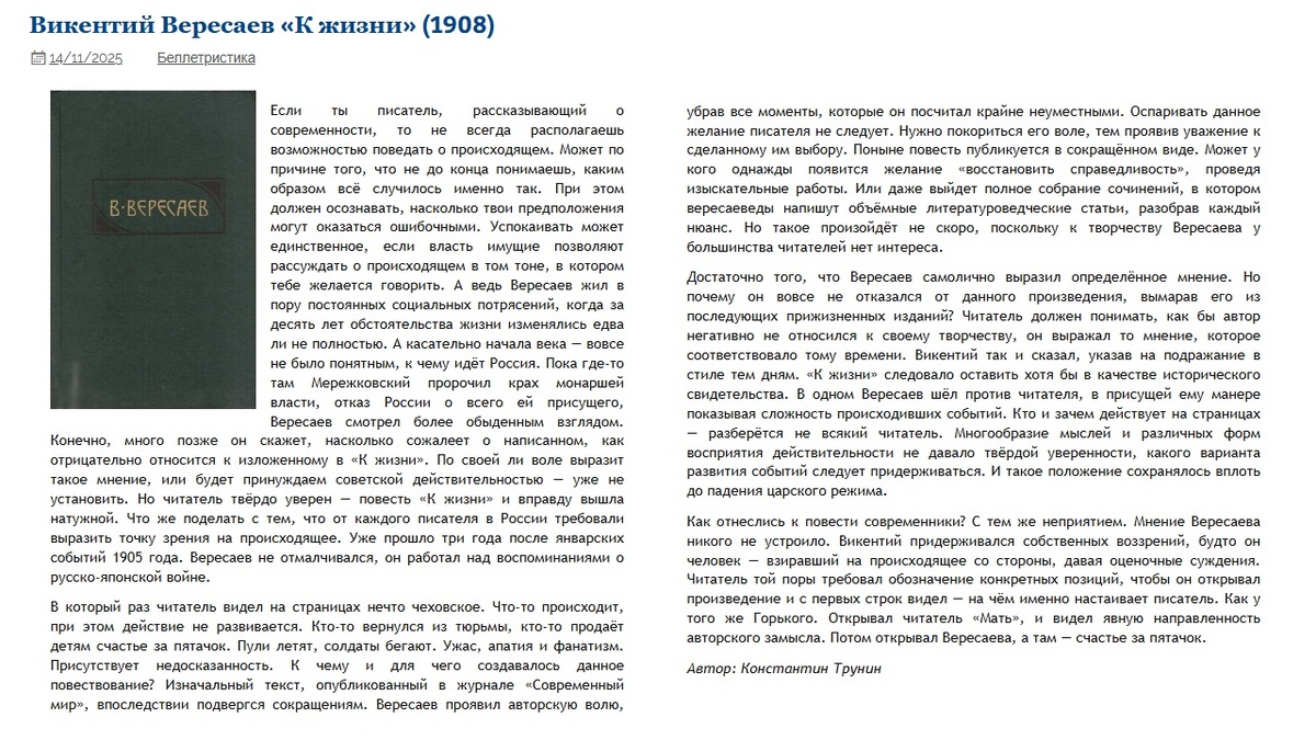 Викентий Вересаев «К жизни» Критика