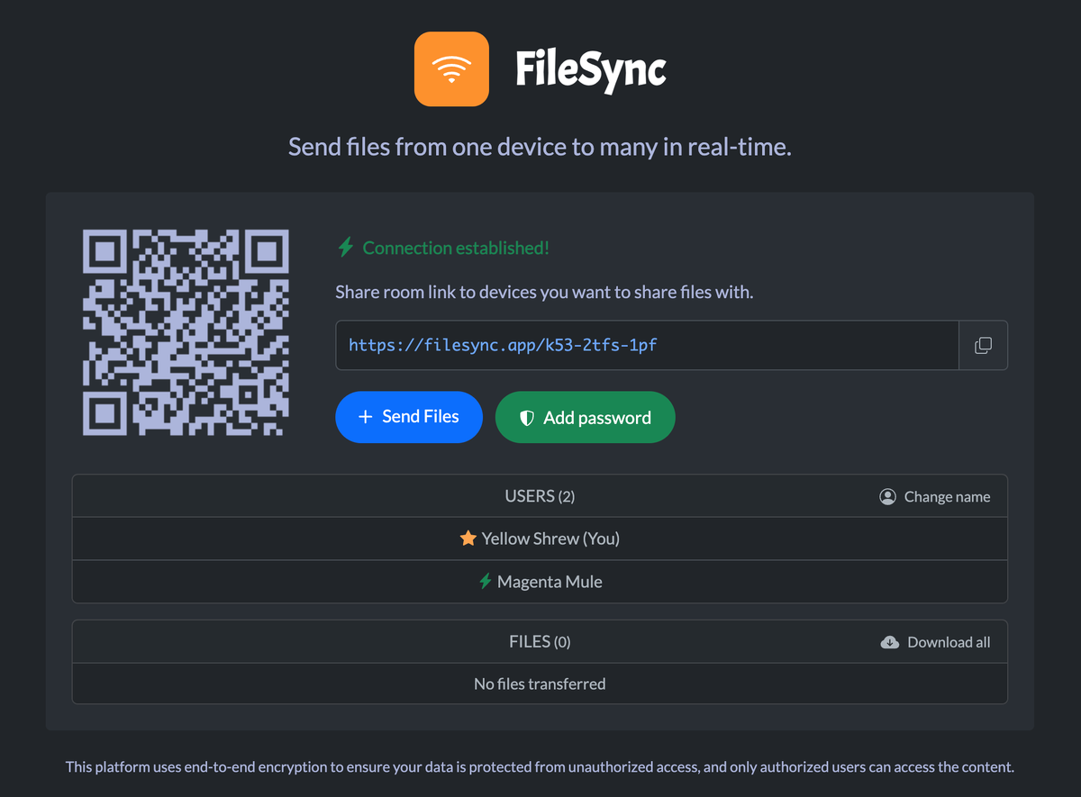 FileSync — это простое веб-приложение с открытым исходным кодом, предназначенное для безопасной и быстрой передачи файлов между несколькими устройствами. Используя технологию WebRTC и сквозное шифрование (End-to-End Encryption), оно позволяет отправлять файлы напрямую через веб-браузеры, минуя хранение данных на удаленных серверах. FileSync разработан как инструмент для быстрой передачи файлов "по требованию", а не для непрерывной синхронизации папок. * Прямая передача через WebRTC: Устанавливает прямое peer-to-peer соединение между устройствами для быстрой и эффективной передачи данных. * Сквозное шифрование (E2EE): Гарантирует, что передаваемые файлы защищены, и только отправитель и получатель могут получить к ним доступ. * Передача "по требованию": В отличие от инструментов синхронизации, FileSync используется только тогда, когда вам нужно отправить определенные файлы. * Самостоятельное размещение (Self-hosted): Приложение можно легко развернуть на собственном сервере; образ Docker