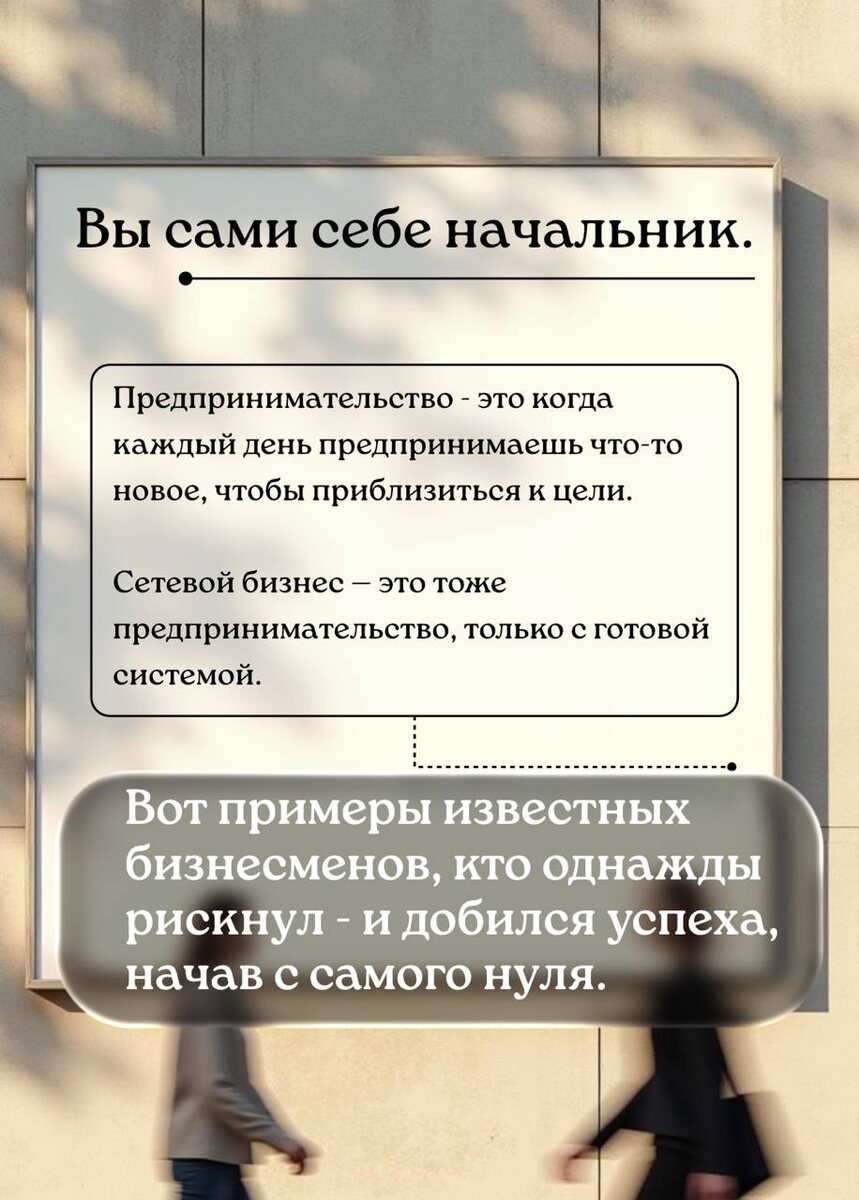 💭Но, ни у кого никогда не возникнет мысли подумать, что предпринимательство это не серьезно! А сетевой и предпринимательство очень похожи. ❗️Только вот сетевой - это бизнес без рисков. Что делает предприниматель? ☑️Он предпринимает действия. Каждый день. ☑️У него есть цель, вера и дисциплина. ☑️Он строит своё дело, делает шаги, ищет решения, не сдаётся. Сетевой - тот же путь. Здесь вы сами себе начальник. Вы решаете, какой будет ваш результат. Каждый день вы предпринимаете - и растёте. А теперь взгляните на истории людей, которые тоже начинали с нуля свое дело. И только ежедневные действия и настойчивость привели их к результату👌🏻