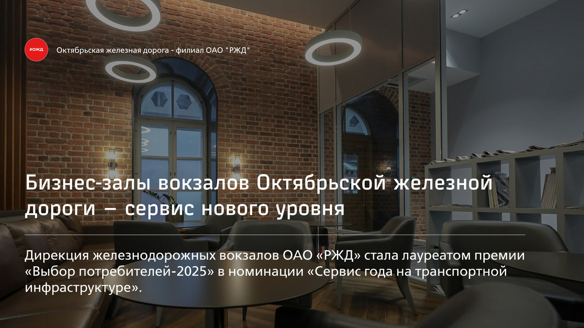 Дирекция железнодорожных вокзалов ОАО «РЖД» стала лауреатом премии «Выбор потребителей-2025» в номинации «Сервис года на транспортной инфраструктуре». Награда присуждена за развитие бизнес-залов нового формата — современного сервиса, который уверенно выводит железнодорожные вокзалы на уровень лучших международных стандартов. 📍На Октябрьской железной дороге новые бизнес-залы ждут пассажиров на двух вокзалах: ✅Московский вокзал ✅Петразоводск Такие залы объединяют технологичность, функциональность и современный дизайн, благодаря чему пассажиры могут воспользоваться: – просторными лаунж-зонами; – рабочими пространствами; – комнатами для переговоров; – детскими зонами; – душевыми; – линией питания в формате «шведского стола». Каждый зал создаётся индивидуально, с учетом архитектуры вокзала и потребностей пассажиров. Такой подход позволяет сочетать исторический облик зданий с современным уровнем удобства и сервиса. 🏫Всего по сети РЖД уже функционирует 14 бизнес-залов нового формата. Проект