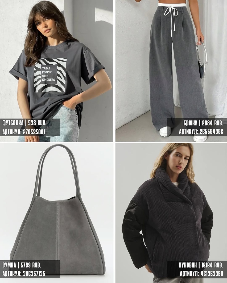 Эта тёплая подборка с ВБ показывает, что осень и зима — не повод прятаться в бесформенные вещи. Графитовый монохром создаёт спокойный городской базис, сливовые акценты добавляют глубины и благородства, а вишнёво-красные детали отвечают за настроение и энергию.