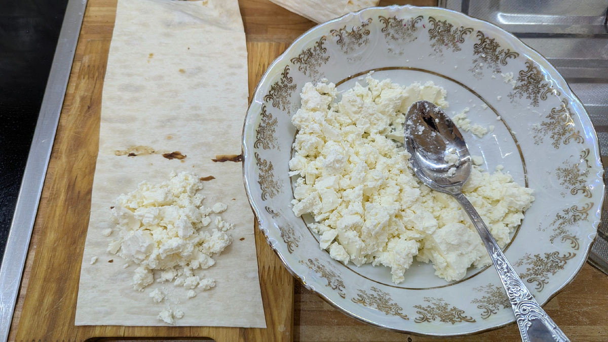 Сыр греческий, типа брынзы, натерла на тёрке, потом ложкой выкладывала сыр на лаваш и аккуратно завернула по диагонали, то в одну сторону, то в другую.