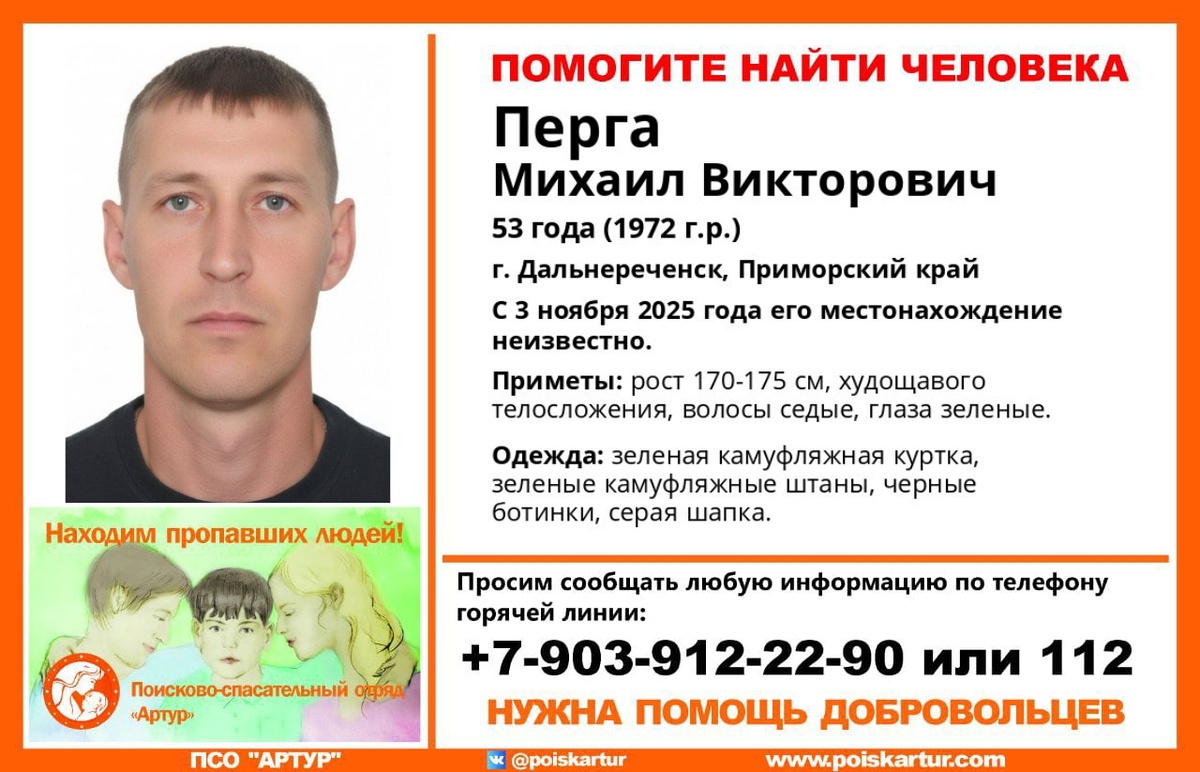 Пропал #Перга Михаил Викторович, 53 года, г. #Дальнереченск, #Приморский край С 3 ноября 2025 года его местонахождение неизвестно. если у вас есть сведения, которые могут посодействовать поиску,