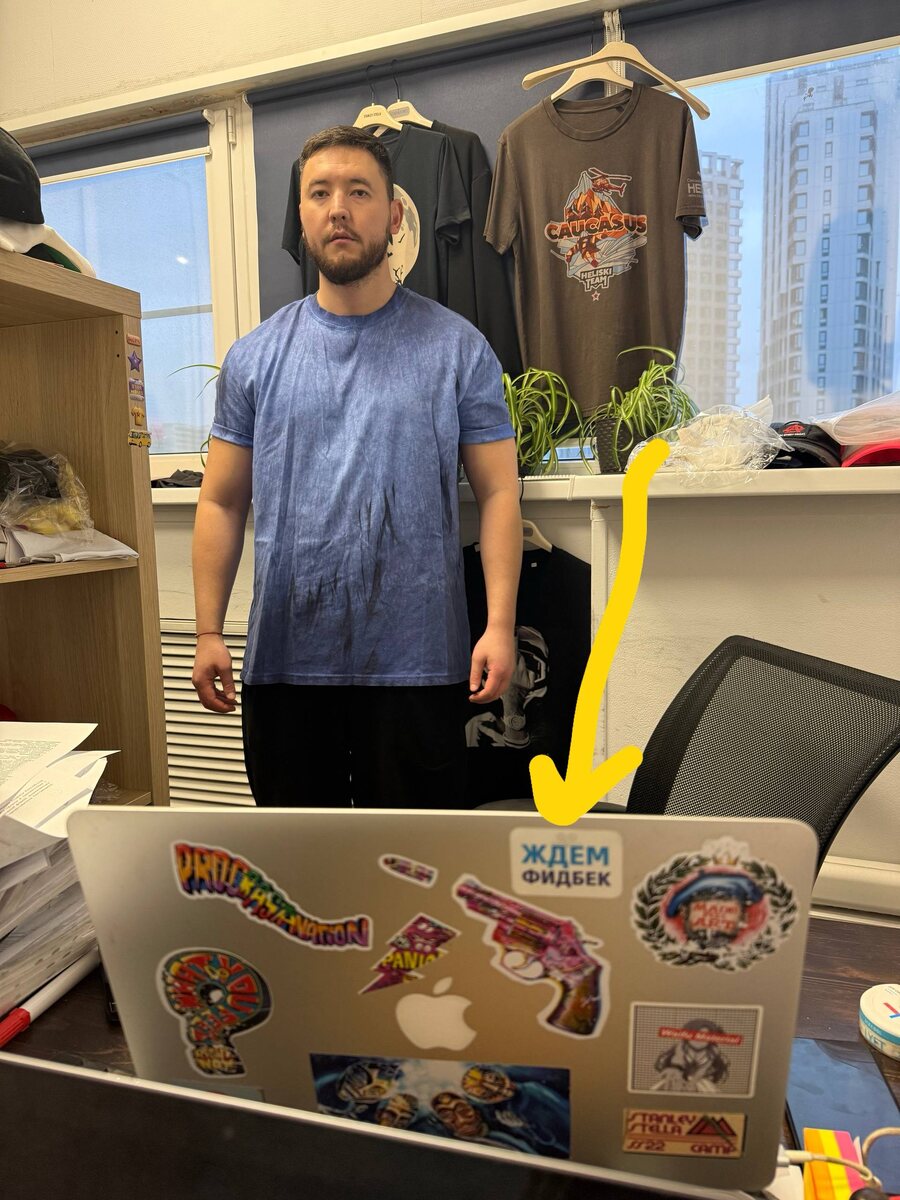 А это Артур, он тестирует одну из футболок и ждет фидбек по проектам