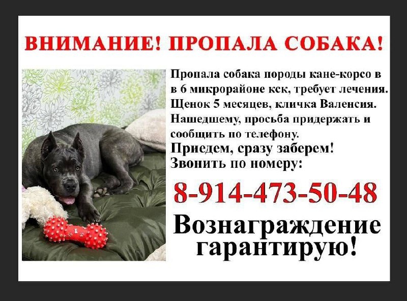 Пропала сабака породы кане-корсо, собака нуждается в лечении.В 6 микрорайоне кск. Щенок 5 месяцев по кличке Валенсия.Собака не агрессивная,контактная.Придержите, пожалуйста, сразу приедем заберём!!! Позвонить по номеру 89144735048. Вознаграждение гарантирую, не обидим.