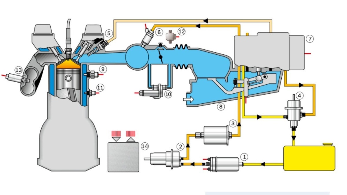 - Состав: Электрический бензонасос, топливный аккумулятор, дозатор-распределитель ("паук"), топливные магистрали и механические форсунки.