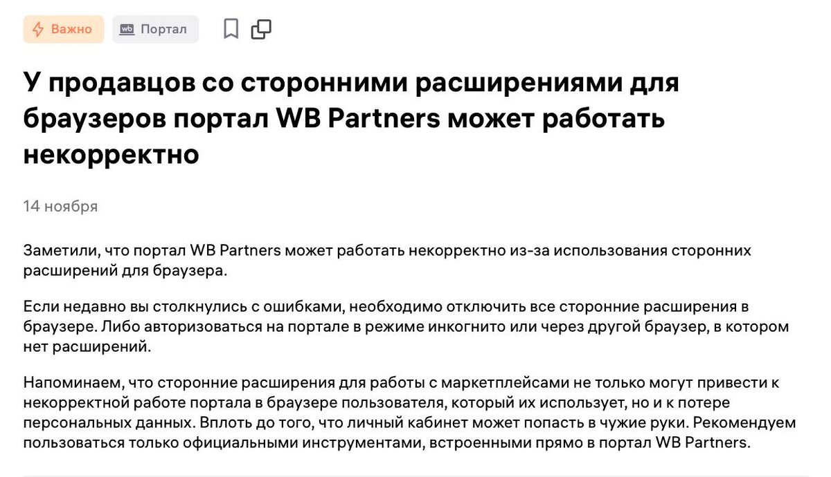 ⚠️ Важно: новость WB НЕ касается расширения MP Manager WB сегодня предупредил, что некоторые сторонние расширения могут вызывать ошибки в портале Partners и создавать риски для данных. Получили много вопросов – сразу уточняем: 💚 Наше расширение к этим инструментам не относится. Оно работает ТОЛЬКО на сайте Wildberries, не подключается личному кабинету, и не влияет на работу портала. Поэтому отключать расширение не нужно – оно полностью безопасно и работает корректно. Что даёт бесплатное расширение MP Manager: 📊 тип продвижения конкурентов; 📈 историю цен, скидок и продаж; ⚡️ CTR, CPC и аналитику прямо в выдаче. Удобно, безопасно и бесплатно. Еще не установили расширение? Рассказали, как это сделать здесь ⬅️ #WB #Аналитика #Расширение