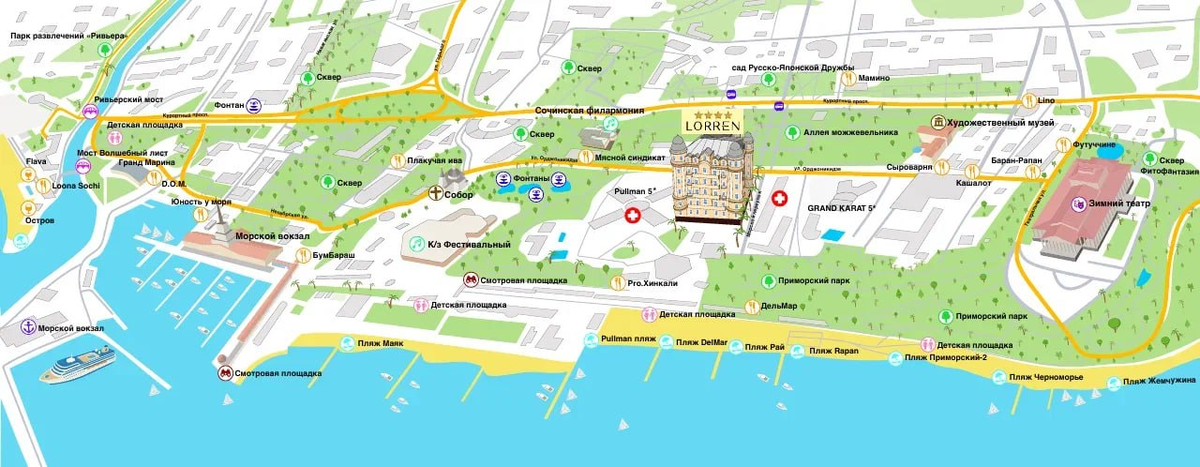 Останавливаясь в нашем отеле, вы оказываетесь в самом сердце Сочи. Здесь каждая прогулка превращается в маленькое путешествие. Вокруг нас много интересных мест: от музеев и парков до стильных ресторанов и уютных пляжей В нескольких минутах ходьбы находятся главные культурные площадки города: — Художественный музей