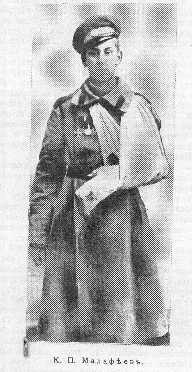 Сколько трогательной любви к ближнему и неподдельного величия в этих скромных словах 15-ти-летнего пожарного добровольца – идти спасать наших братьев! В этом геройском порыве молодого Малафеева не было стремления только порисоваться, что он и доказал, будучи ранен, храбро сражаясь в рядах нашего славного войска, проливая кровь за славу и величие Родины.