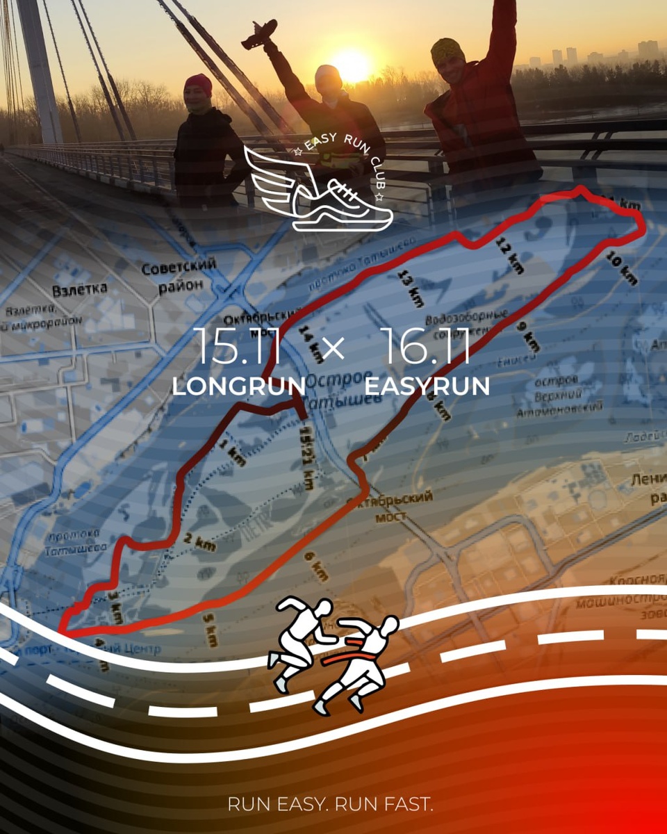 Открывай календарь и ставь две задачи: 15 ноября в 8:00 — пробежать длительную в хорошей компании и стать немного выносливее. Встречаемся у Триумфальной арки на БКЗ. Побежим по треку Лисы (www.toplist.run/race/11313), т.е. всего у нас выйдет не больше 16-17 км. А потом можно заскочить позавтракать в Академию кофе или Дом у озера, или что там ещё рядом есть )) 16 ноября в 7:30 — потрусить easy и позавтракать в весёлой компании. Мы встречаемся под Коммунальным мостом на центральной набережной. Бежим обычно 5-7 км. А на завтрак в Кофейную мануфактуру. LONG & EASY — ❤️