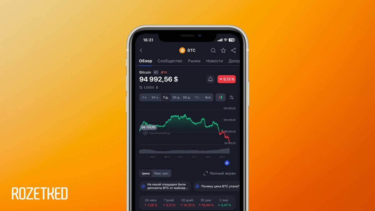 Bitcoin обрушился, обвалился, посыпался, лопнул После пика, достигнутого в октябре, стоимость первой криптовалюты резко упала со 125 до 94 тысяч долларов. Это падение ожидаемо потянуло за собой и весь остальной рынок. Рынок криптовалют за сутки потерял больше 200 миллиардов капитализации. 💼 Rozetked | Подписаться