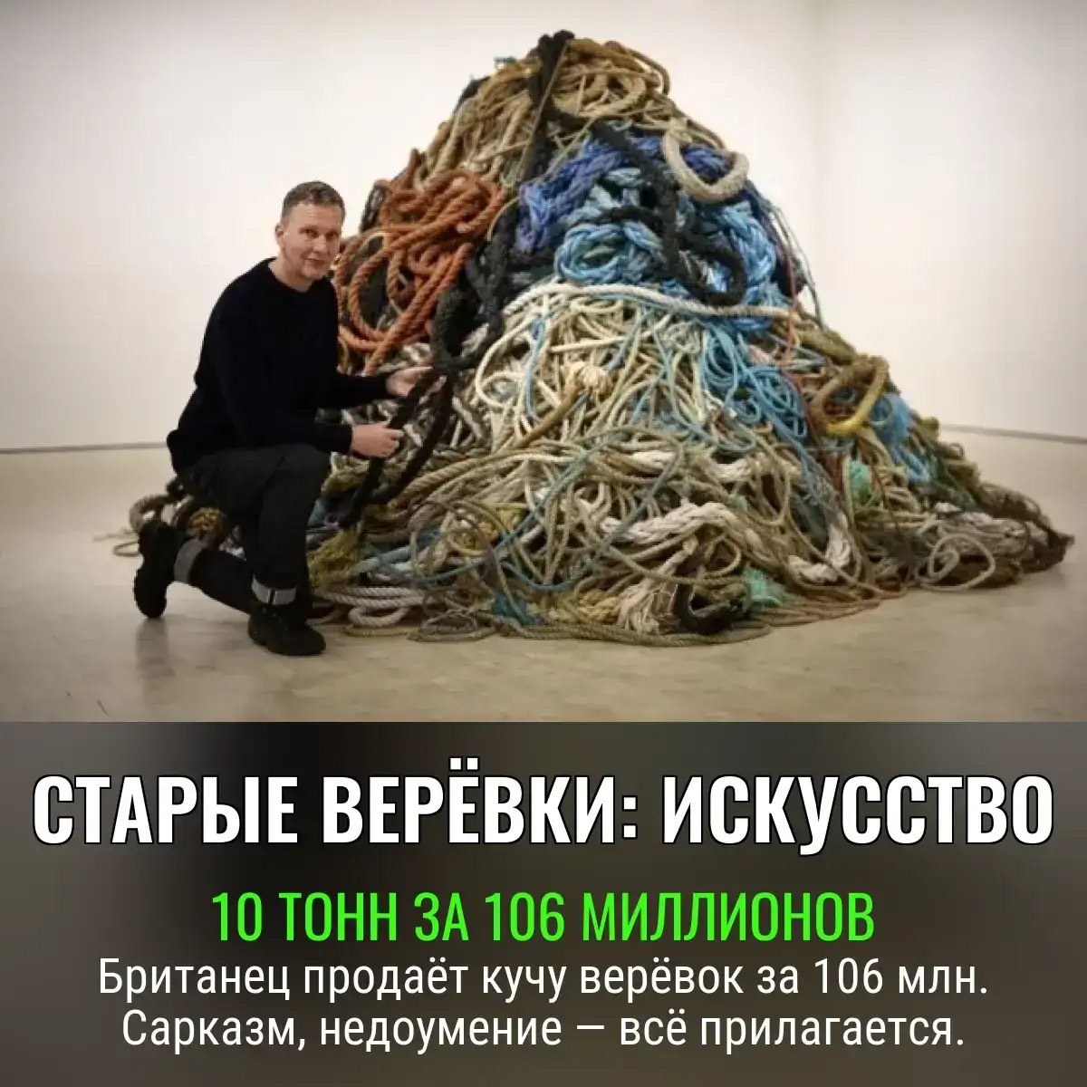Дэвид Стригли, британский художник, решил, что куча старых верёвок (10 тонн!) стоит ровно миллион фунтов. Такой «гениальный» арт от человека, который за смыслом гоняется по портам и рыбным лавкам. Прекрасный способ выкинуть деньги на ветер, если у вас их слишком много. По мнению местных критиков — это не искусство, а разводка, но спрос наверняка появится. Ещё бы, ведь за такую сумму можно купить кусочек британского флота... из мусора. 🤡 К слову, недавно в Тайване уборщик попытался навести порядок, но вместо этого превратил экспонат в мусор окончательно., Следите за новостями 📩