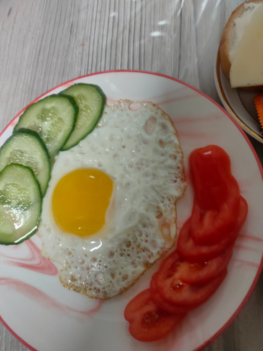Доброго дня всем вам, милые дамы , верные спутники моего канала, а также те, кто из интереса заглядывает на его страницы! Меня зовут Надежда, и я приглашаю Вас на мою кухню, где покажу Вам мое меню на день. Сегодня я опять еду в город по делам: записалась еще в среду в СФР, надо оформить пенсионные накопления мужа, еще при его жизни приходило уведомление дважды, но вытащить его не могла. Встала по будильнику. На улице плюсовая температура, а когда вышла. даже заморосил небольшой дождь. Вообще странная нынче погода6 дождь вперемешку со снегом. Скорее бы установилась погода. Времени до автобуса у меня достаточно. Запись в 12.50, но выезжать надо в 10.13. Потом будет перерыв. Несмотря на то, что времени еще уйма, с завтраком сильно заморачиваться не стала: обычная глазунья + ломтики свежего помидора и огурца. Глазунью я люблю и готова есть ее каждый день. А также заварила черный растворимый кофе ( опять никак не соберусь намолоть зернового), к кофе сделала бутерброд с маслом и сыром, ка