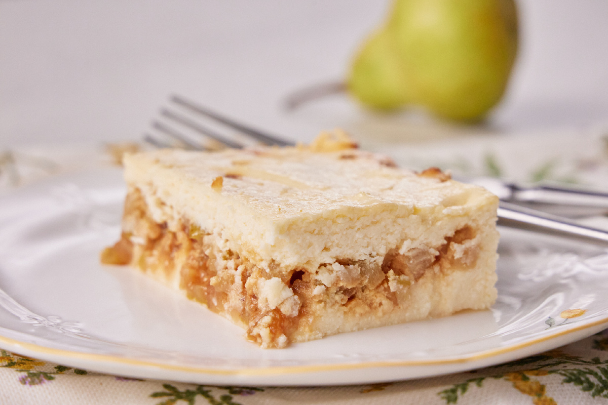 Ингредиенты: Творог зернёный 5% 650 г Яйца 3 шт. Сахар 150 г Ванильный сахар 2 ч. л. Крахмал кукурузный 2 ст. л. Лимон (сок) 1/6 шт. Груши 2 шт. 430 г Корица 1/3 ч. л. Соль 2 щепотки Приготовление: 1. Грушу нарезать мелким кубиком. На сухую разогретую сковороду насыпать 50 г сахара и растопить до коричневого цвета. Отправить грушу в карамель и обвалять со всех сторон на медленном нагреве. Добавить 1/3 ч. л. корицы, перемешать и томить ещё пару минут. Снять с нагрева, взбрызнуть соком 1/6 лимона и перемешать. 2. Разбить 3 яйца и отделить белки от желтков, переложив в отдельные миски. 3. В желтки отправить творог, ванильный сахар, сахар (100 г), 1 щепотка соли и перебить (измельчить) с помощью погружного миксера до пюреобразной массы. 4. Добавить в конце перебивания творога крахмал и перебить погружным блендером. 5. Белки с щепоткой соли взбить в отдельной миске венчиками миксером до увеличения в объёме. 6. В творожную массу добавить часть взбитых белков и аккуратно перемешать с