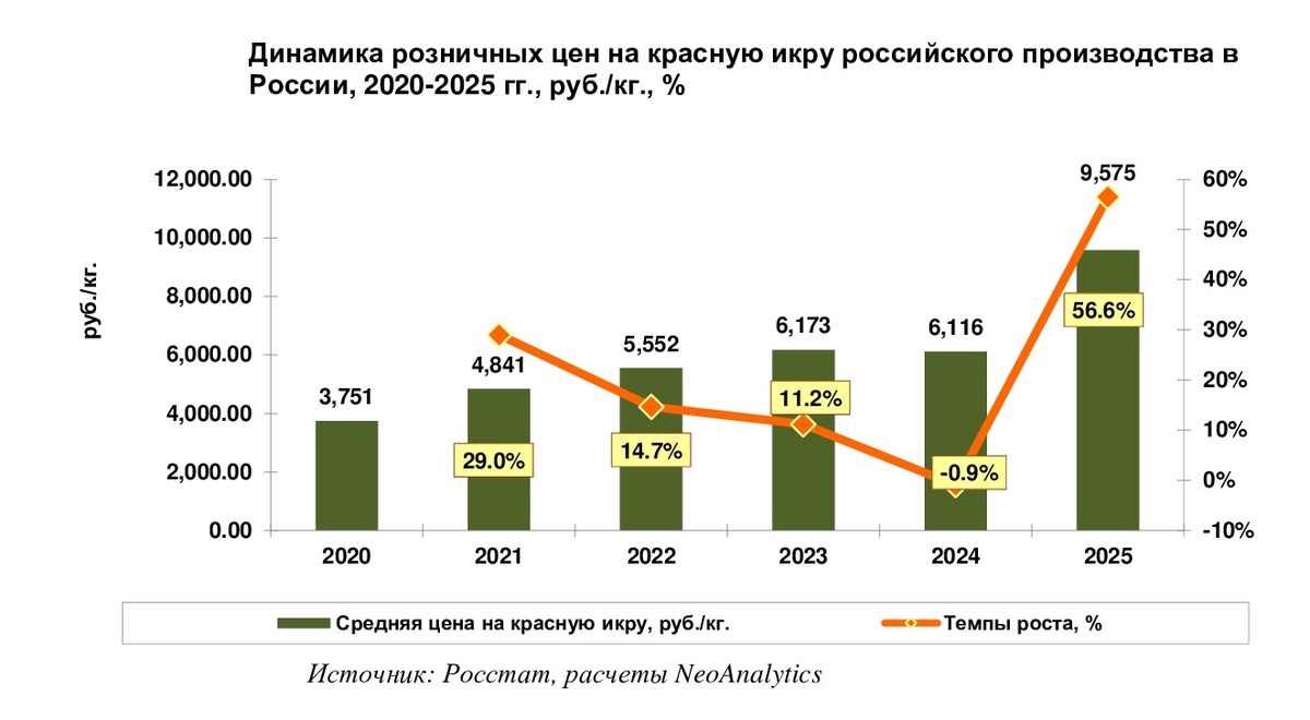 В ходе ежемесячного мониторинга розничных (потребительских) цен на красную икру (икра лососевых) отечественного производства, проведенного NeoAnalytics, выяснилось, что на основании данных официальной статистики в 2025 г. средняя розничная цена на красную икру российского производства выросла на 56,6% относительно аналогичного показателя годом ранее и составила 9 575 руб. за кг. В 2025 г. динамика роста средней цены существенно усилилась. В целом это беспрецедентное увеличение в ретроспективе периода 2020-2025 гг. Годом ранее, в 2024 г., цена несколько снизилась и была зафиксирована на отметке в 6 116 руб. за кг. Это единственный год за период 2020-2025 гг., когда цена упала, хотя и не значительно. Но, тем не менее, в сравнении с 2020 г. цена выросла практически в два раза, а в 2025 г. по отношению к 2020 г. – уже в три. Таким образом, средний ежегодный прирост показателя средней цены на красную икру отечественного производства в ретроспективе 2020-2025 гг. составил 22,1%. Если рассмат