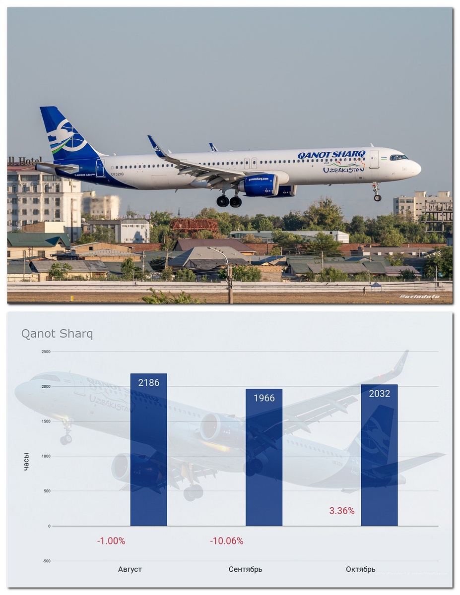Итоги октября: Qanot Sharq В октябре закончил техническое обслуживание и вернулся к полётам Airbus A330 UK33020, благодаря чему общий налёт немного вырос. Среднесуточный налёт на одно воздушное судно практически не изменился, увеличившись ⬆️ на 0.01% и составил 10.55 часа. Суммарное количество часов налёта воздушных судов авиакомпании Qanot Sharq за октябрь увеличилось 🔼 на 3.36% по сравнению с сентябрём и составило 2032 часа. Общая динамика за последние 3 месяца представлена на графике. #статистика #qanotsharq #октябрь2025