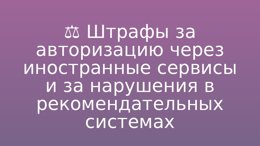 В Госдуму внесён законопроект о введении новой ст. 13.53 КоАП: за неисполнение обязанности по авторизации пользователей — штраф 10–20 тыс. руб. для физлиц и 500–700 тыс. руб. для юрлиц. Регистрация должна осуществляться через биометрию, телефон или российские сервисы. Также предлагается штрафовать до 700 тыс. руб. за нарушения в сфере рекомендательных технологий, если они затрагивают права граждан или нарушают закон.