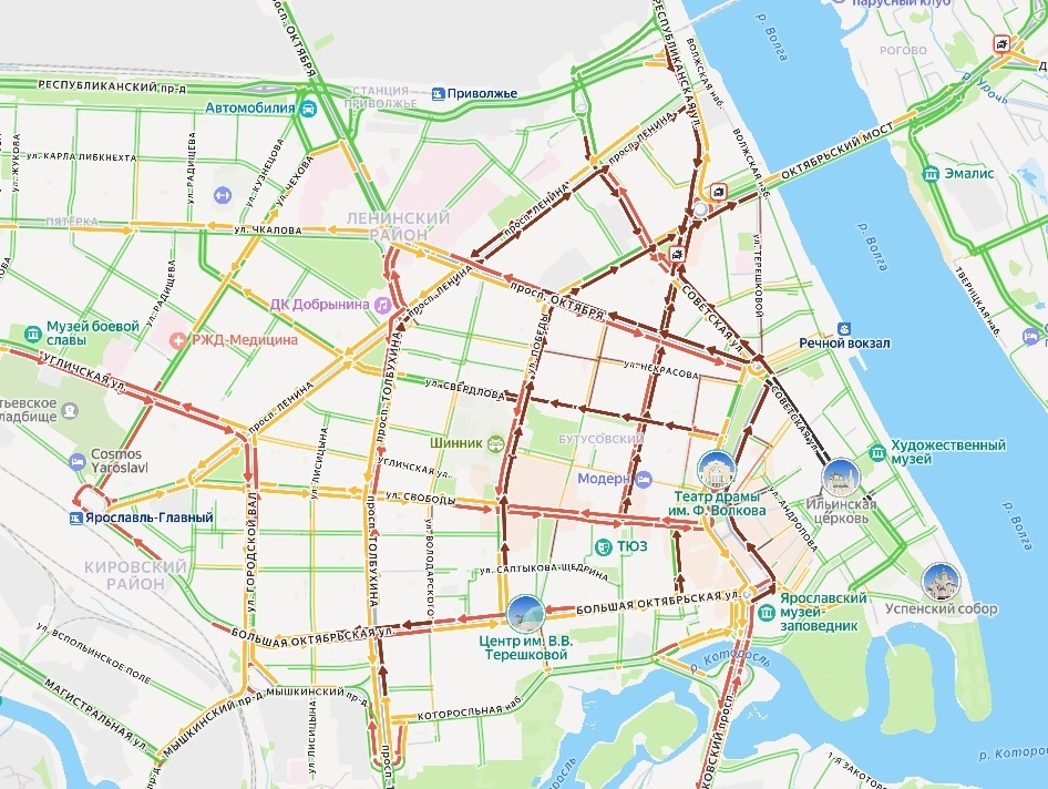 Особенно сложная ситуация в центре. Вечер пятницы, 14 ноября, стал проблемой для многих жителей столицы «Золотого кольца», спешащих после рабочего дня домой. Быстро добраться до своих квартир у людей, видимо, не получится. Причем как у автовладельцев, так и у тех, кто пользуется общественным транспортом. Кроме трамвая, разумеется. По словам очевидцев, пробки в городе достигли 10 баллов. Подтверждает эту информацию и сервис «Яндекс. Пробки». Хуже всего ситуация обстоит в центре Ярославля. Там улицы окрашены даже не в красный, а в бордовый цвет, что означает очень сильную загруженность дорог. Можно предположить, что заторы связаны с погодными условиями. К бушующему уже не первый час в городе ветру добавился еще и дождь. В результате в разных частях Ярославля случились сразу несколько ДТП.