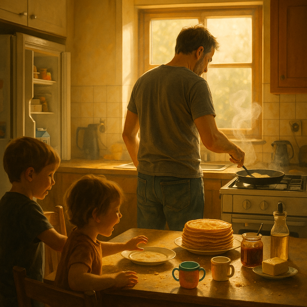 Андрей наливал тесто, переворачивал блины, складывал стопкой. Сковорода шипела размеренно, будто поддерживала ритм утра. Дети болтали о своём — он не вслушивался, просто ловил их голоса, как фон жизни.