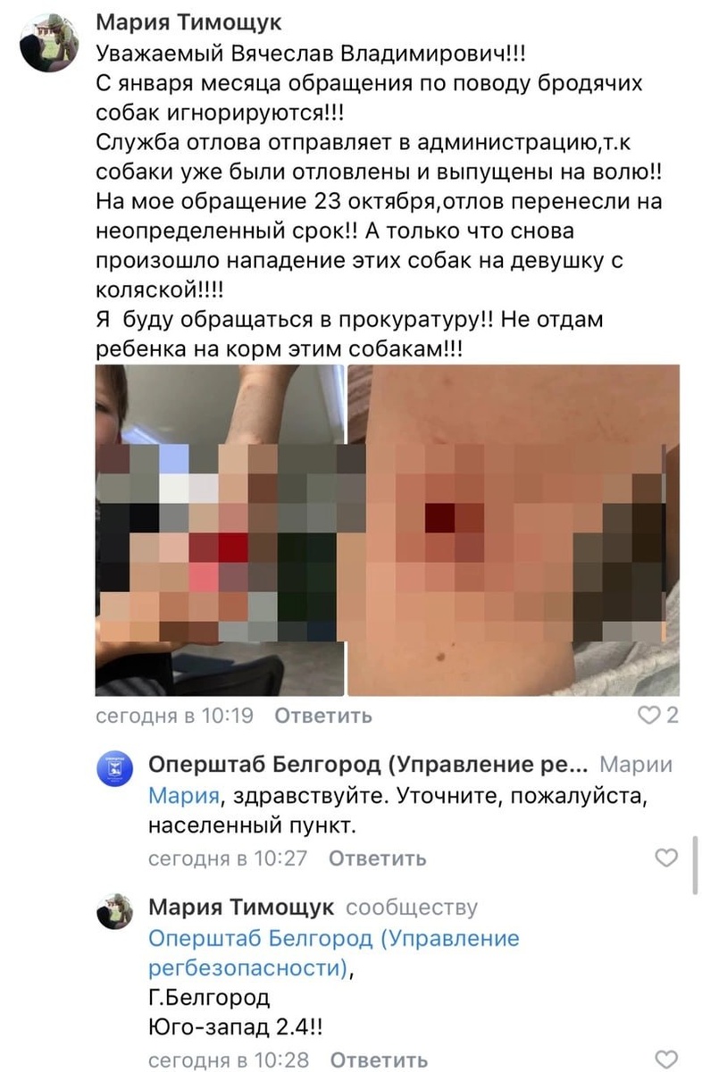 Бродячая собака прокусила руку ребёнку в Белгороде Бродячая собака напала на ребёнка и укусила за руку в Юго-Западном микрорайоне Белгорода. Об инциденте рассказала жительница микрорайона на странице губернатора в соцсетях. Женщина опубликовала кадры окровавленной перевязанной руки мальчика и сообщила, что горожане с января не могут добиться отлова животных и намерены обратиться в прокуратуру. По словам автора, недавно собаки напали на девушку с коляской. «Служба отлова отправляет в администрацию, так как собаки уже были отловлены и выпущены на волю. Я буду обращаться в прокуратуру. Не отдам ребёнка на корм этим собакам», — возмутилась белгородка. На обращение отреагировал мэр города Валентин Демидов. Он пообещал взять ситуацию на личный контроль и сообщил, что в микрорайоне будет проведена проверка по отлову собак. Подписаться на 🗞🗞 | Поддержать бустом