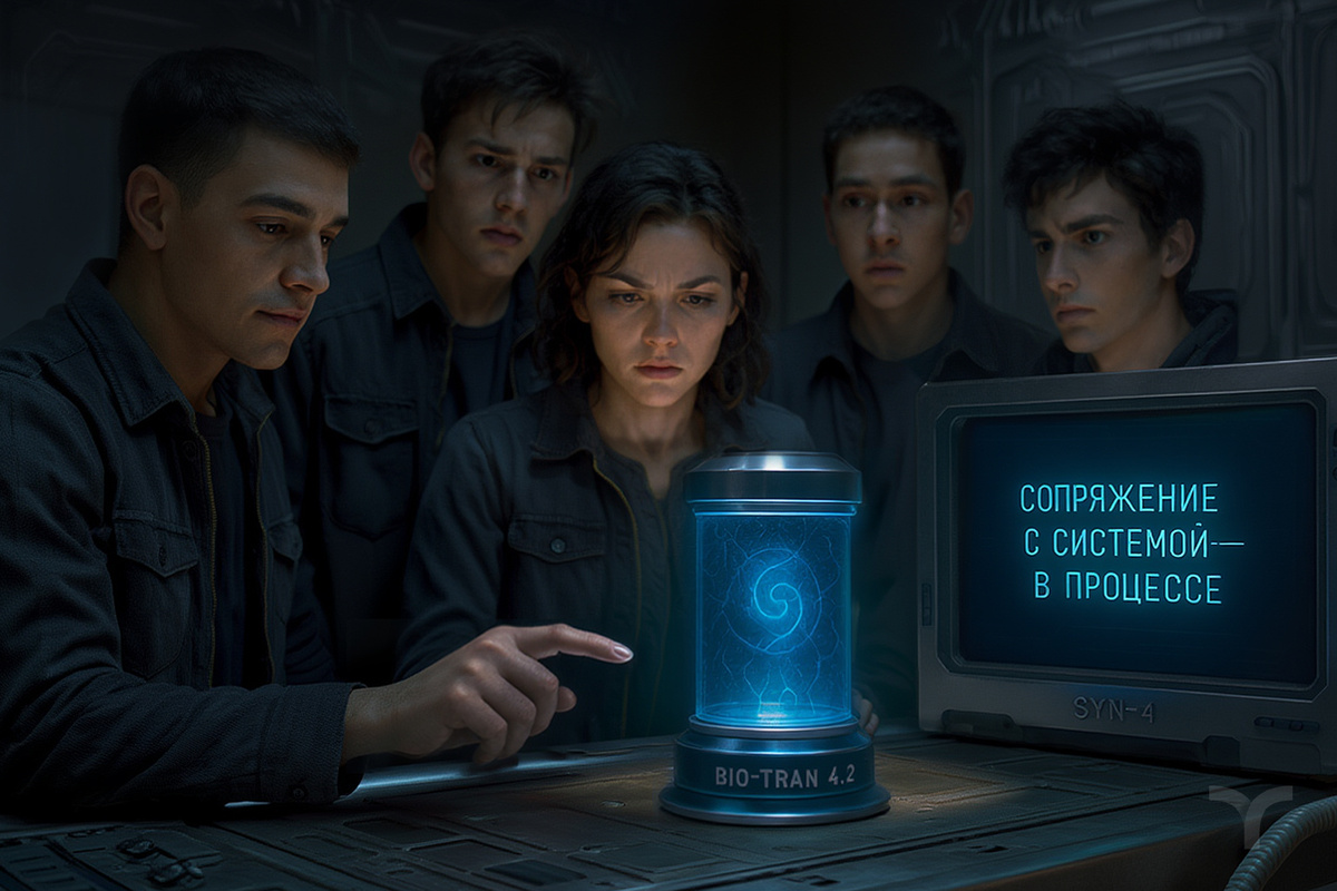 Капсула стояла в центре командного отсека, рядом с основным ядром управления SYN-4. На её поверхности по-прежнему мерцал символ — тонкая спираль, сплетённая из линий света. Рэйа проверила соединение: — Энергопитание стабильно. Поле внутри активно. Нэйт поднял взгляд: — Предлагаю подключить её к системе. Пусть корабль сам покажет, что с этим делать. Тэрин молча кивнул: — Подключаем. Если SYN-4 действительно ждал эту доставку — посмотрим, как он отреагирует. Кио установил капсулу на модуль сопряжения. Она мгновенно отреагировала — короткая вспышка света прошла по корпусу, устройство «проснулось». Он ввёл команду на пульте: тонкие кабели протянулись к разъёмам, контакт подтвердился тихим звоном. На панели «BIO-TRAN 4.2» загорелась надпись: СОПРЯЖЕНИЕ С СИСТЕМОЙ — В ПРОЦЕССЕ. — Есть отклик, — сообщил Кио. — Канал связи открыт. — Смотри, — шепнула Рэйа. — Он сам обновляет протокол. Свет в отсеке чуть приглушился. Потом экран ядра ожил — строки данных потекли одна за другой. Кио посмотрел
