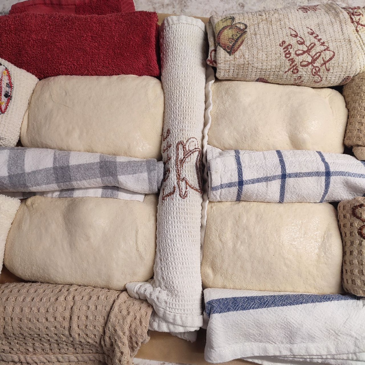 Вот завидую я белой завистью блогерам, у которых стол украшен, цветов букет, свечи горят, а она формует в кружевном переднике и на лён французский заготовки укладывает! Сказка! 😍 Я тоже так хочу! Но, делаю как проще и удобнее. Наверное лентяйка. Даже наверняка! 😝 Вот такая раскладка чиабатты вышла, подоткнутой полотенцами, разными🤣 И ведь лён есть! Французский! Но мне так удобнее, чтоб выдернуть валики и все сразу аккуратно уложено и перекладывать не нужно. Лентяйка однозначно по части эстетики! 💯 Да, кстати, подформовала их в этот раз чуть после разрезания. Так ровнее, мне больше нравится