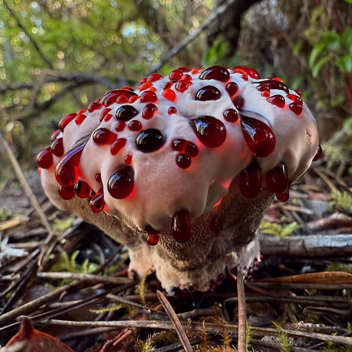 😶🌫️ Гиднеллум Пека (Hydnellum peckii) - один из самых необычных и впечатляющих грибов в мире. 🩸 "Кровавый зуб"- это его самое известное прозвище. Молодые плодовые тела выделяют на своей белой или светло-розовой поверхности ярко-красный или рубиновый сок, похожий на капли крови. Эта жидкость просачивается через поры гриба. 🍽️ Гриб не считается смертельно ядовитым, но он горький до невозможности. Попытка его съесть была бы крайне неприятной. 👨🔬 Ярко-красная жидкость содержит пигмент, известный как атроментин. Это вещество обладает мощными антикоагулянтными (кроворазжижающими) и антибактериальными свойствами. Ученые изучают его потенциальное применение в медицине.