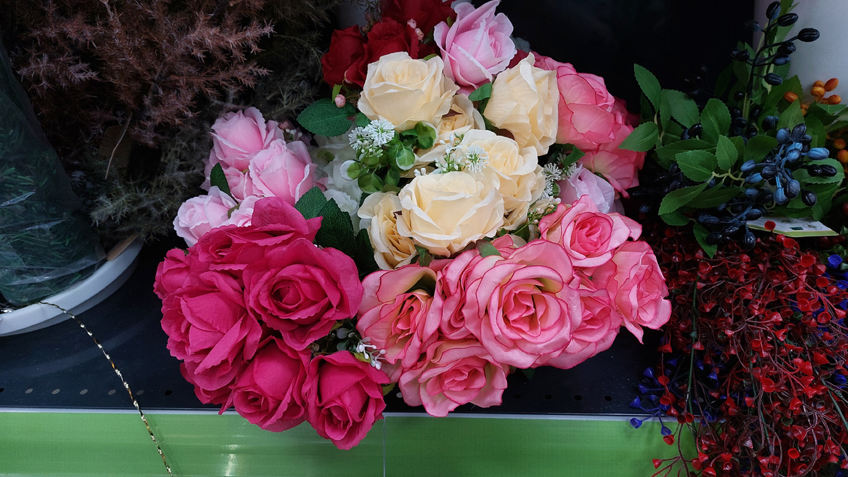 Появился новый букет искусственных роз — очень удачная и аккуратная работа. Лепестки выполнены без видимых недочётов, клей не торчит и совсем незаметен, благодаря чему цветы выглядят максимально естественно. Длина букета 45 см, купить можно за 225 рублей. В ассортименте представлены разные расцветки, так что можно подобрать вариант под любой интерьер или настроение.