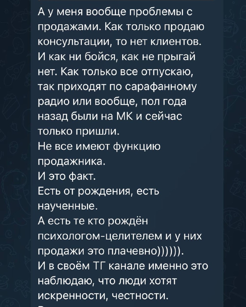 «Как только продаю консультации, то нет клиентов. Есть те кто рождён психологом-целителем, и у них продажи — это плачевно.» Если вы рождены психологом-целителем, если это ваше предназначение, то продажи у вас будут легче и больше, чем у топового менеджера. Для многих сейчас продажи — это что-то отдельное. Что-то, с чем либо рождаются, либо учатся, присоединяя это к себе. Хотя продажа — это настройка контакта между потребностью вашего клиента и вашим продуктом. Если вы предлагаете человеку купить продукт, а он его не покупает, то это значит, что он ему не нужен. Либо нужен, но не так сильно, как что-то другое. Функция продажника: это услышать, что человеку нужно, и предложить ему это. Всё. Любая продажа строится на этом. Всё остальное — повышение конверсии и вероятности, что человек купит. НО! Если вы не услышали, что человеку нужно, либо предложили ему не то, что нужно — он не купит ни с какими вашими навыками продажника. На деле же у большинства с канала не покупают потому,