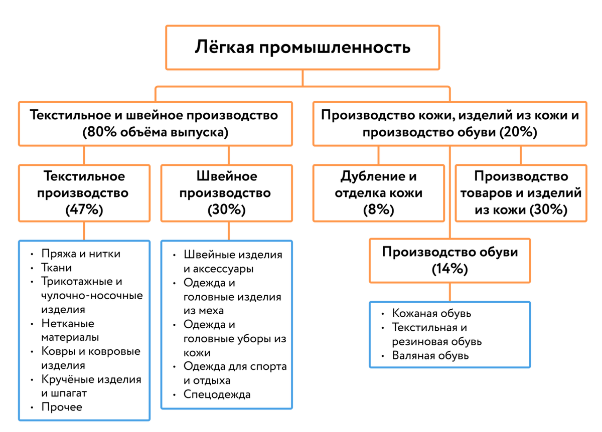 Лёгкая промышленность имеет сложную структуру, она включает текстильное и швейное производство (около 80% объёма выпуска) и производство кожи, изделий из кожи и обуви (20%).