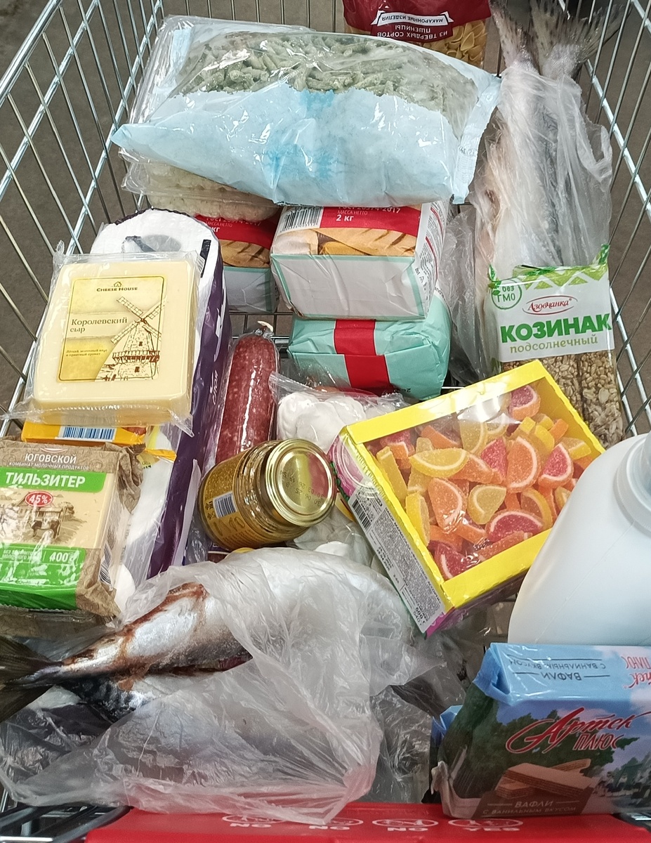 Всем привет!!! Когда бываю в городе , то всегда захожу в этот магазин и без покупок не ухожу. Цены подросли, как и во всех магазинах. Это моя тележка, а теперь, что я накупила. Кому не нравятся распаковки можете не смотреть. Не является рекламой данного магазина❗❗❗ Вроде купила все нужное, сумма вышла приличная, но об этом потом. Уже третий раз беру такую муку, мука хорошая и недорогая Вафли Артек, 200 гр Гель для стирки такой взяла Сыр Королевский, такой брали один раз, на вкус нормальный Сыр Тильзистер, такой не брали, был другой этого комбината, вкусные сыры Сыр Белорусское золото Ракушки Знатные, цена пока прежняя Вареники с картошкой, Рязанские, вкусные, не разваливаются Горбуша, в этот раз была потрошёная, не крупная, взяла 2 штуки, на суп и запечь. По 440 рублей за кг Сельдь х/к одну взяли . Скумбрию 2 шт взяла посолить Творог 5%, беру такой, но думаю сделан из сухого молока Колбаса с/к классическая Состав так себе Колбаса с/к Черкизово Состав👇 Фасоль стручковая замороженная,