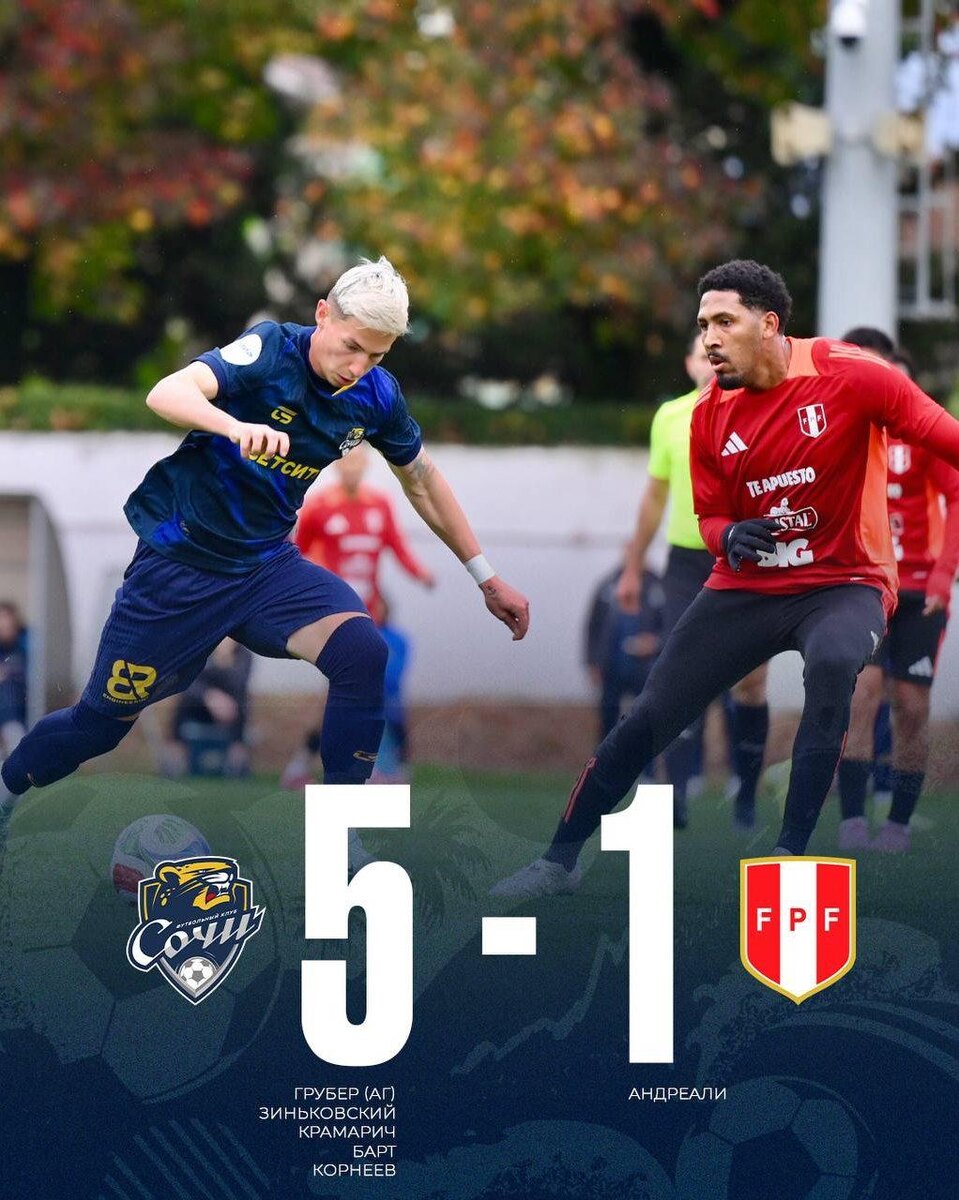 😱 Что-то пошло не так... Сборная Перу после ничьей со сборной России провела в нашей стране ещё один товарищеский матч и потерпела разгромное поражение. Она уступила... «Сочи». Команда, идущая на 15-м месте в турнирной таблице РПЛ, отгрузила южноамериканцам пять мячей. Отличились Антон Зиньковский, Мартин Крамарич, Руслан Барт и Артём Корнеев, также автором автогола стал Фабио Грубер. За перуанцев единственный мяч забил Франческо Андреалли. Российская сборная, напомним, в Петербурге упустила победу над футболистами из Перу — 1:1. 🤔 Внимание, вопрос: когда в национальную команду вызовут игроков из «Сочи»? @russian_rt_sport