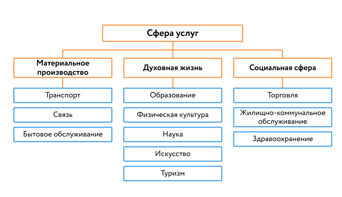 Сфера обслуживания — совокупность отраслей хозяйства, которые предоставляют людям услуги, а не продукты. Развитие постиндустриального общества вызвало стремительной рост сферы услуг, которая в свою очередь удовлетворяет различные потребности населения и является важной составляющей современного сельскохозяйственного и промышленного производства. Создаются новые рабочие места, решаются социально-бытовые проблемы, и как результат повышается качество жизни. Сфера обслуживания отражает уровень экономического развития стран. В развитых странах на её долю приходится более 75% ВВП, высок показатель занятого там населения. По данным Всемирного банка, современная Россия по уровню развития сферы услуг занимает промежуточное положение между развитыми и развивающимися странами. На неё приходится 62,3% ВВП страны. Структура сфер деятельности в странах мира, % (2019 г.) Название страны Доля сфер деятельности, % сфера услуг промышленность сельское хозяйство США 80,6 18,5 0,9 Великобритания 79,2 20,2