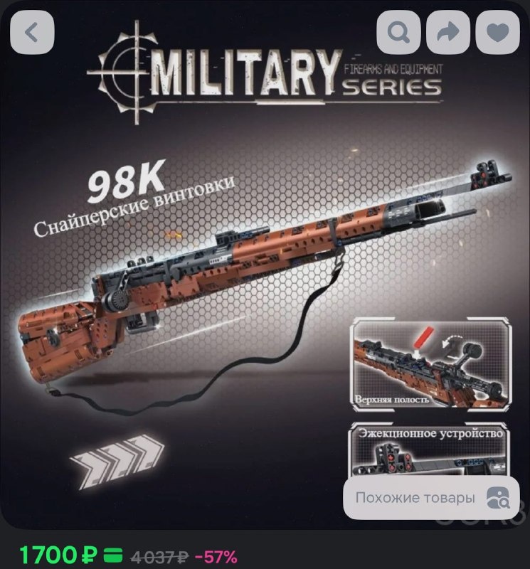 Ту самую Lego-винтовку уже завезли на российские маркетплейсы — лучшую игрушку из кубиков можно урвать примерно за 1700 рублей. Это копия карабина Kar98k: она реально стреляет, у неё полностью рабочий затвор, и в комплекте есть ремешок, чтобы носить пушку на плече как настоящие бойцы. Ссылку подогнали вот здесь. Девочки, если думаете что подарить парню — вот, вариантов больше нет 😳 Подробнее: https://hard-tm.su/threads/127638/ 🕹HARD-TM — Подписаться