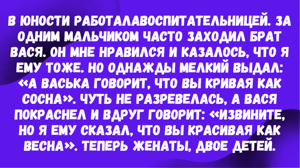 И тут девочка выдает весьма логичный и простой ответ: «А ты сходи к заведующему детского сада и скажи, что ты не наелась, и он тебя отпустит домой». © ksenoledi - Однажды ученик седьмого класса прислал мне фотографию, снятую издалека с сильным зумом в кинотеатре: «Смотрите, как сильно эта женщина на вас похожа! Офигеть, просто двойник!»