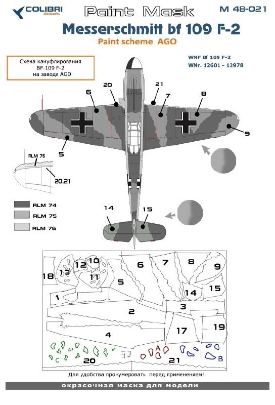 Новосибирская Colibri Decals выпустила самоклеющиеся окрасочные маски для моделей Bf.109F-2 в масштабах 1/72 и 1/48. Маски M 72052/ M 48021 для Bf 109F-2 выпуска завода AGO. Маски с номерами M 72053/ M 48022 для нанесения камуфляжа в соответствии с окраской на заводе Arado. Оба завода выпускали модификацию F-2 кратковременно в 1941 году, большая часть машин попала в эскадры Jg 51 и Jg 54.