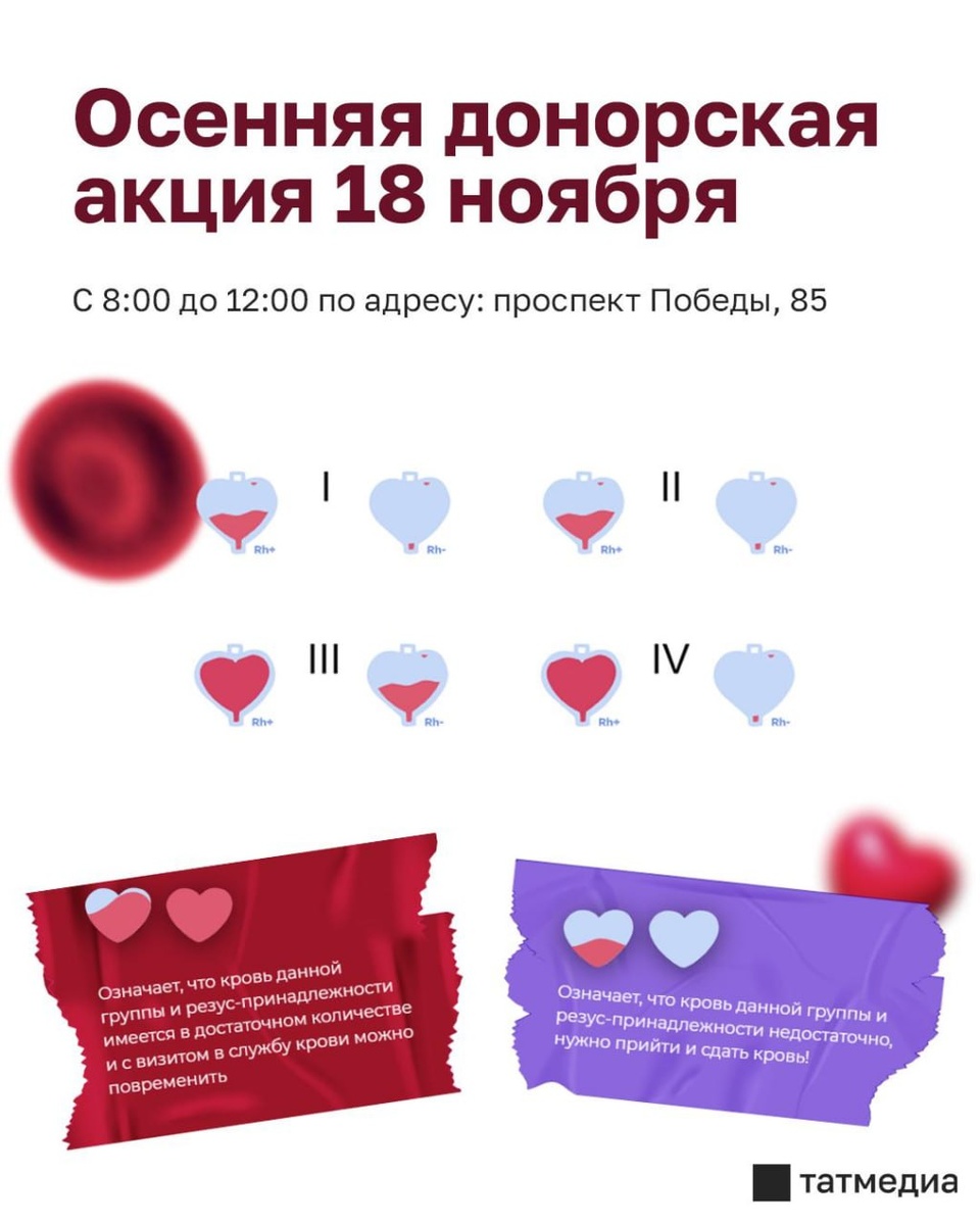 В ответ на пост 🙌🏼🩸В Казани пройдет осенняя донорская акция Кровь можно будет сдать 18 ноября с 8:00 до 12:00 по адресу: проспект Победы, 85. Необходимо иметь при себе паспорт и СНИЛС. Донорами могут быть совершеннолетние граждане весом более 55 кг без противопоказаний по здоровью. Желающие принять участие должны пройти регистрацию по ссылке. @tatmediaofficial | Все каналы Татмедиа ™️ 1-й новостной MAX-канал Татарстана - подпишитесь.