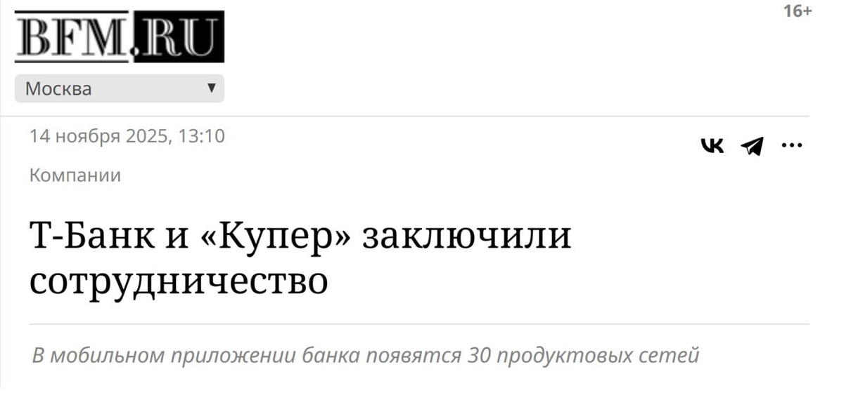 Т-Банк расширяет функционал своего «супер-приложения». В сервис «Супермаркеты» добавят 30 новых продуктовых сетей в рамках партнерства с Купером. К уже доступным «Пятерочке», «Магниту», «Чижику» и «Перекрестку» присоединятся «Ашан», METRO, «Глобус» и другие крупные ритейлеры. В приложении появятся скидки, кэшбэк и акции напрямую от магазинов. Еще один шаг к тому, чтобы не выходить из дома. Бесплатный GPT-bot ⚡️НейроМастер⚡️