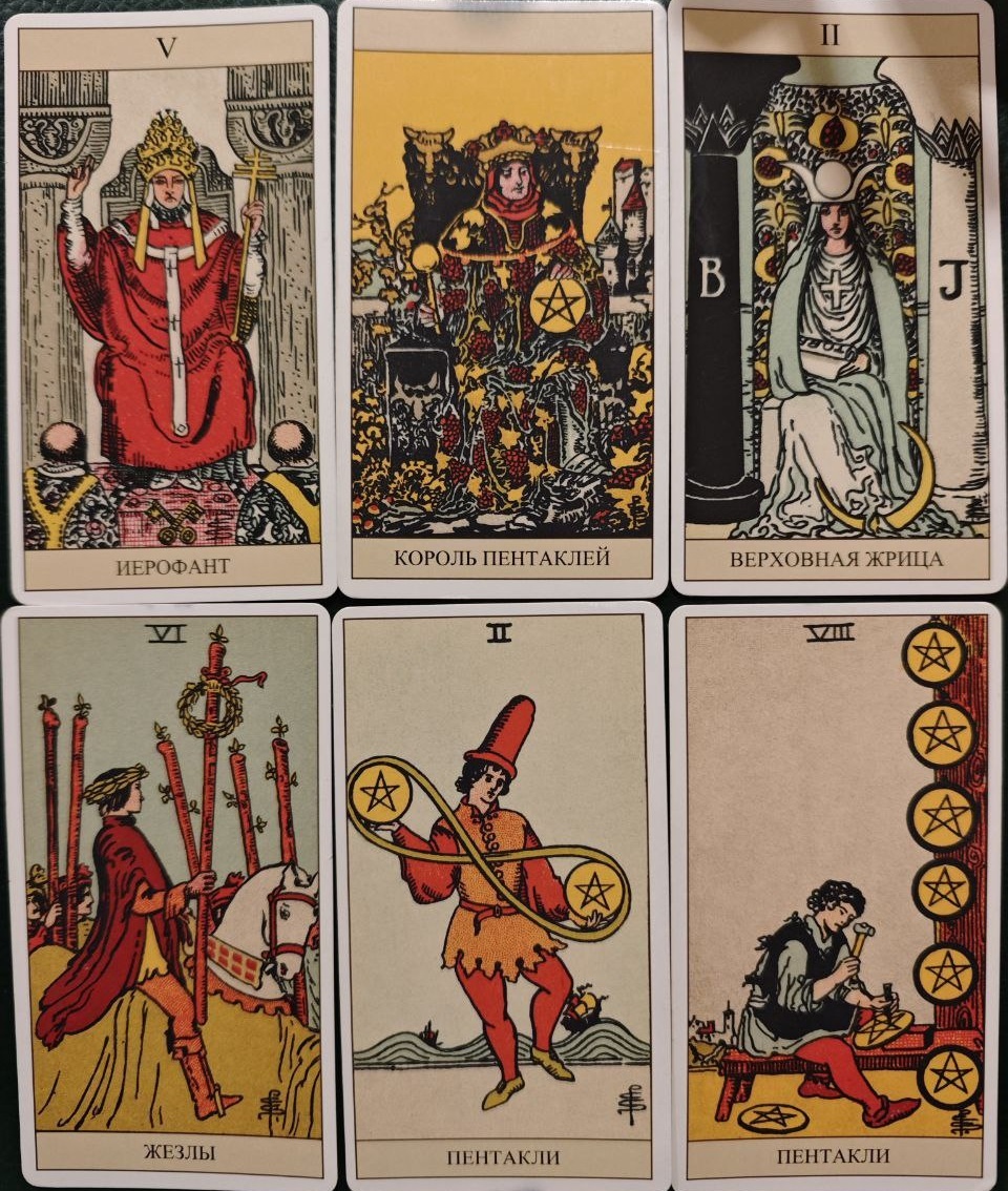 Карты: Иерофант, Король Пентаклей, Верховная Жрица, 6 Жезлов, 2 Пентаклей, 8 Пентаклей.
